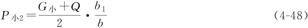 大車*大輪壓在小車的自重和額定起重量作用下,通過小車車輪傳遞到主梁的小車軌道上,再傳遞到大車端梁上,加上大車重量平均分攤到四角車輪組上的輪壓。所以,*大大車輪壓需先計算出小車車輪傳遞到主梁的小車軌道上的壓力P小1、P小2(圖4-47)。