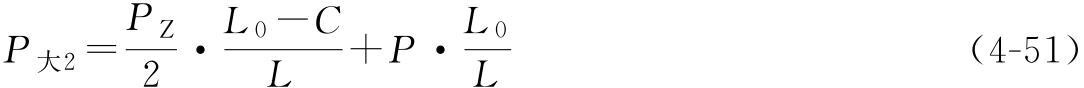 P通過大車端梁作用在全包廂式龍門吊大車每一個角的兩個車輪上,轉(zhuǎn)化到大車軌道平面上的受力分析見圖4-48。四個角上的每組車輪中的P大1、P大2較大值就是起重機的大車*大輪壓。