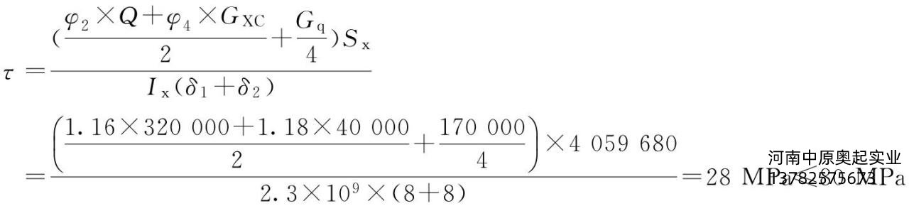 根據(jù)前面計算和用戶給定參數(shù)得:φ2=1.14;φ4=1.16;GXC=40000N;Gq=170000N;Q=320000N;δ1=δ2=8mm;δ3=12mm;δ4=20mm;B2=576mm;[τⅠ]=140/1.732=80MPa;Ix=2.3×109mm4。
