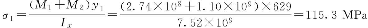 主梁截面幾何參數(shù):Ix=7.52×109mm4;y1=629mm;y2=545mm;Iy=1.62×109mm4;x1=299mm;x2=277mm。