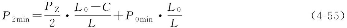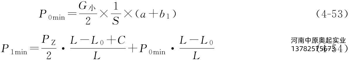 是校核計(jì)算車(chē)輪的一個(gè)經(jīng)典公式,式中Pmax由式(4-50)和式(4-51)計(jì)算可求出,Pmin根據(jù)圖4-47可推導(dǎo)出下式。